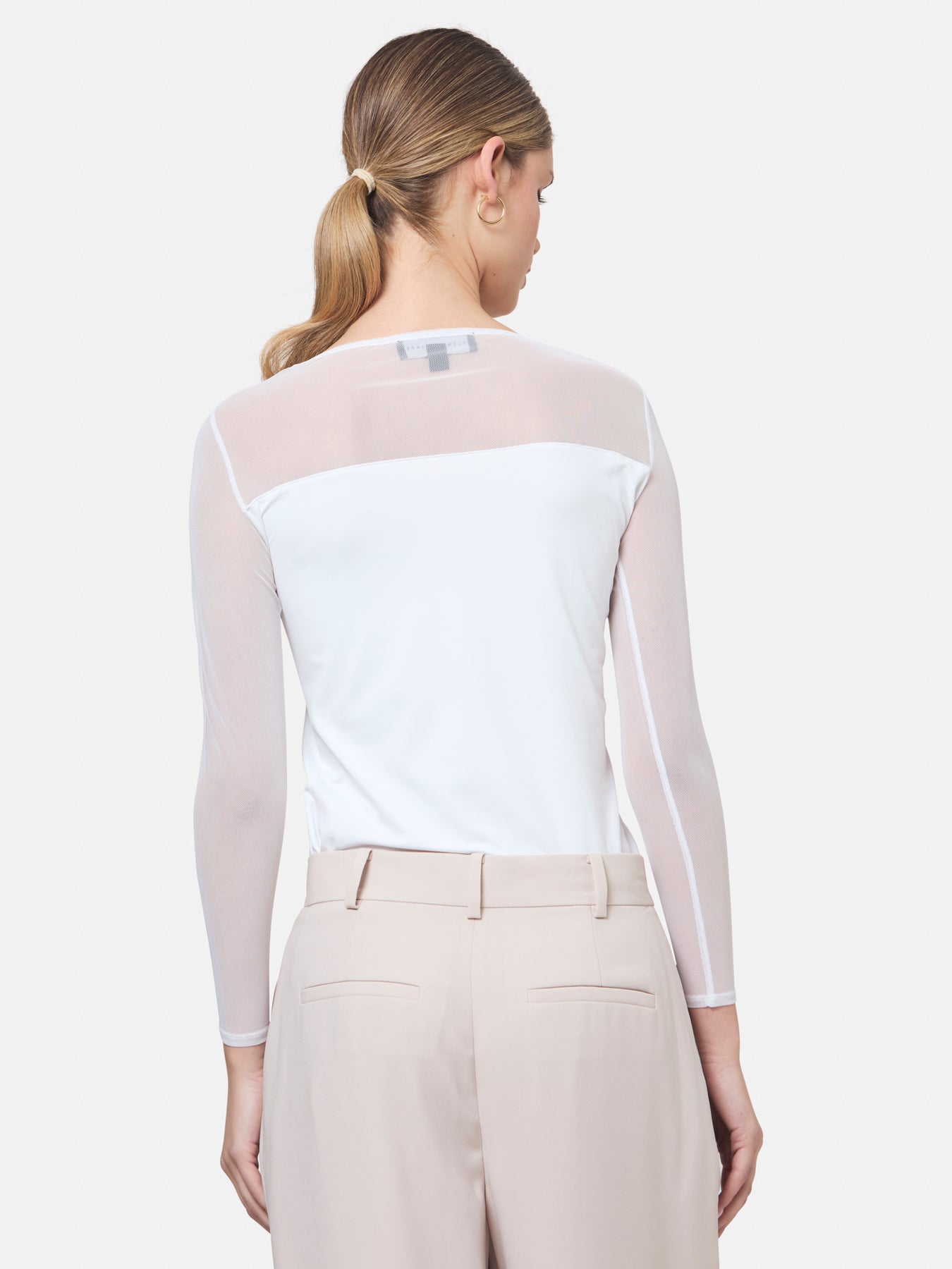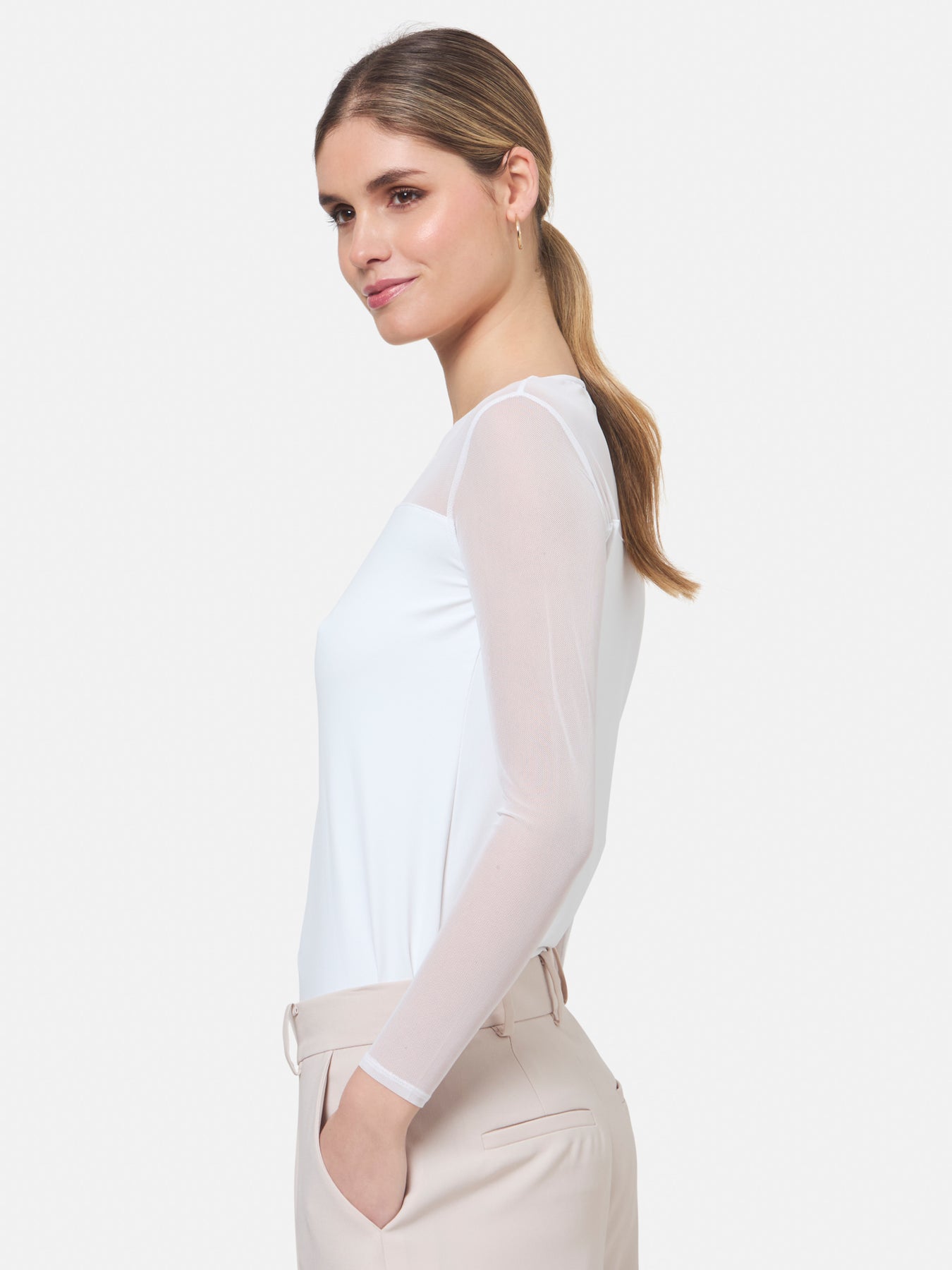 A signature hmca piece. our perennial best-seller. This versatile top features a flattering mesh yoke and sleeves on a snug jersey body. Perfect underpinning to suiting or a more casual pant.