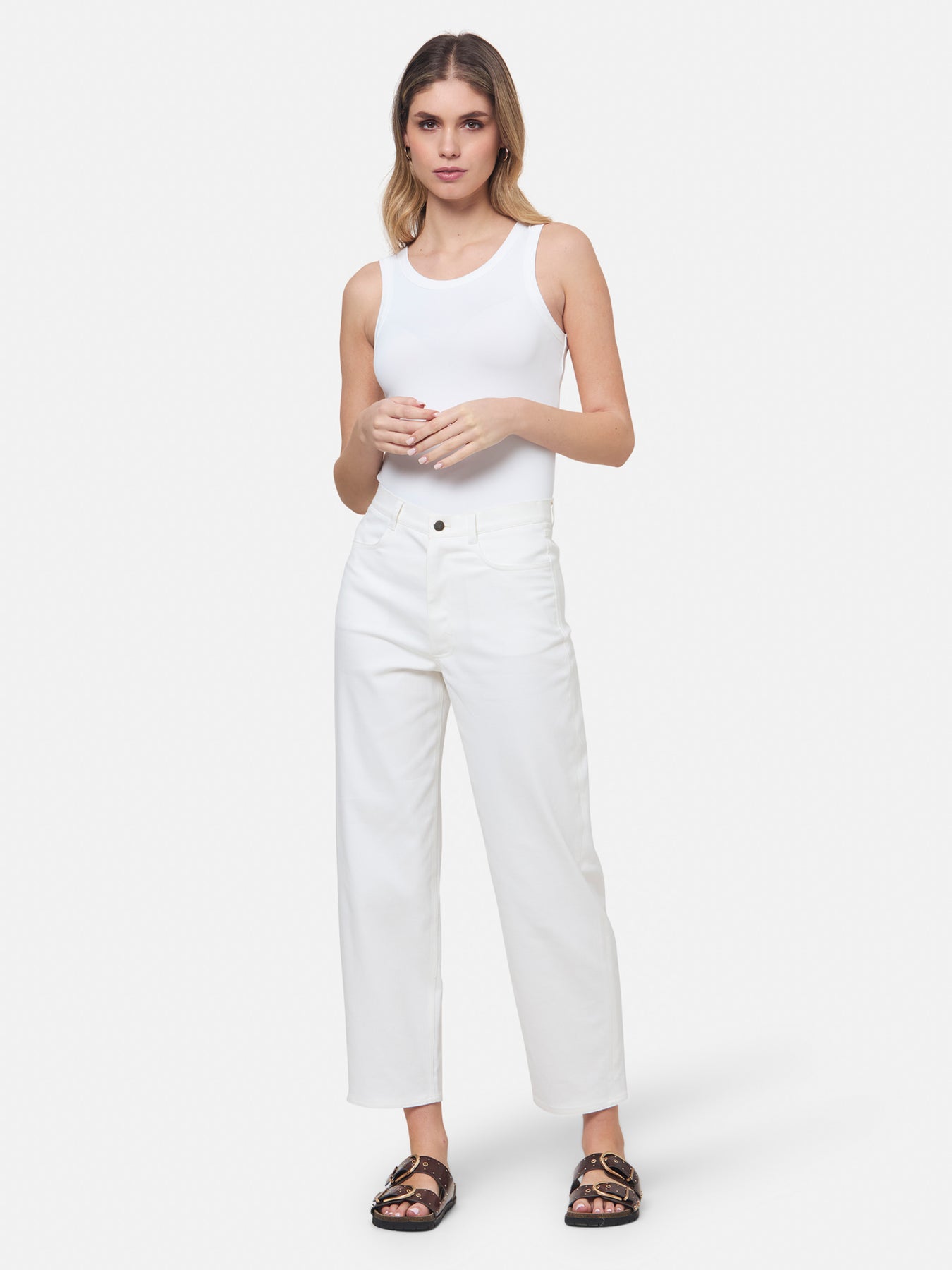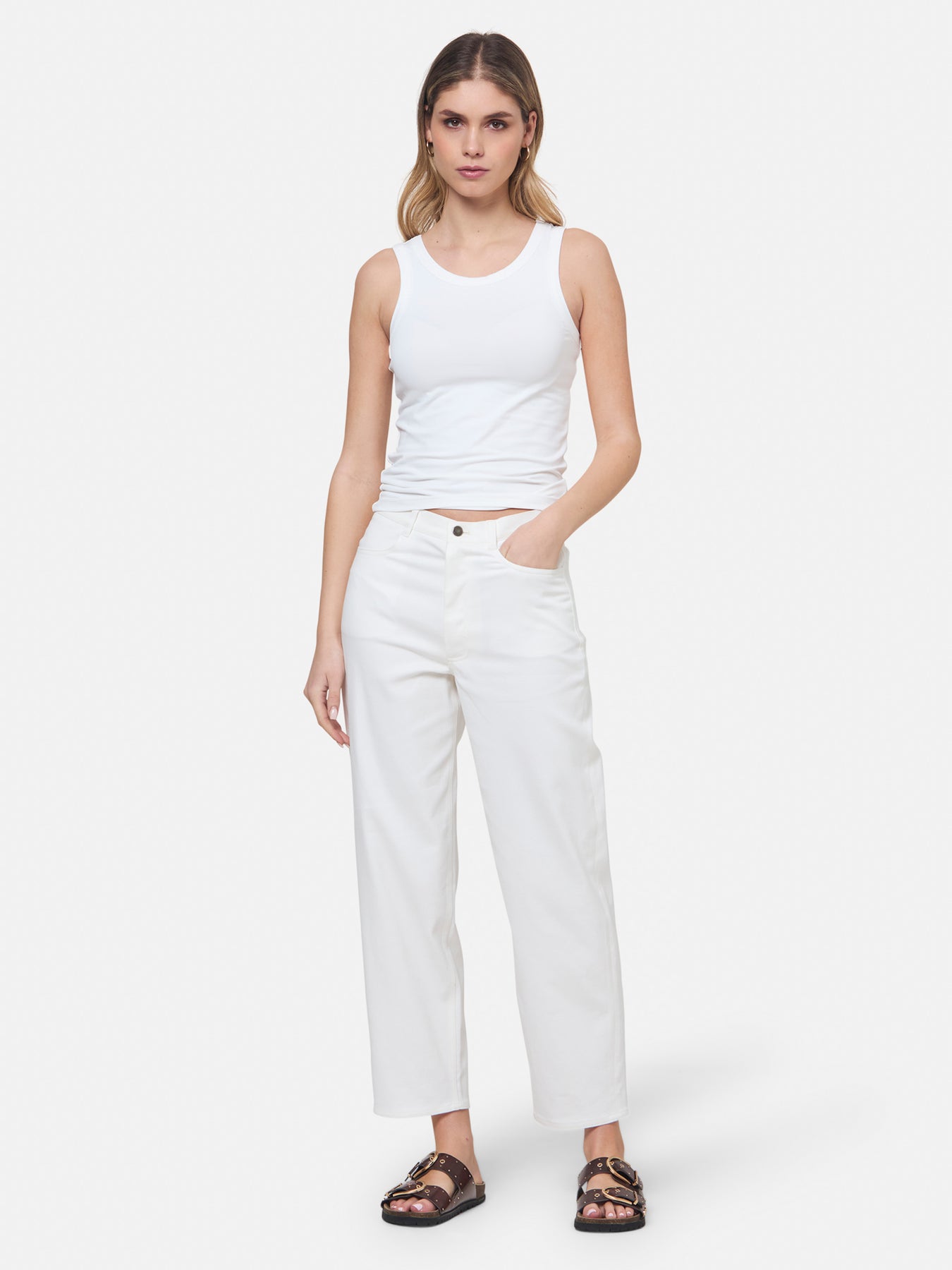 Hit refresh on your everyday essentials with the white Norah tank Top. Crafted in a luxe stretch jersey. Features round neckline and muscle back silhouette.