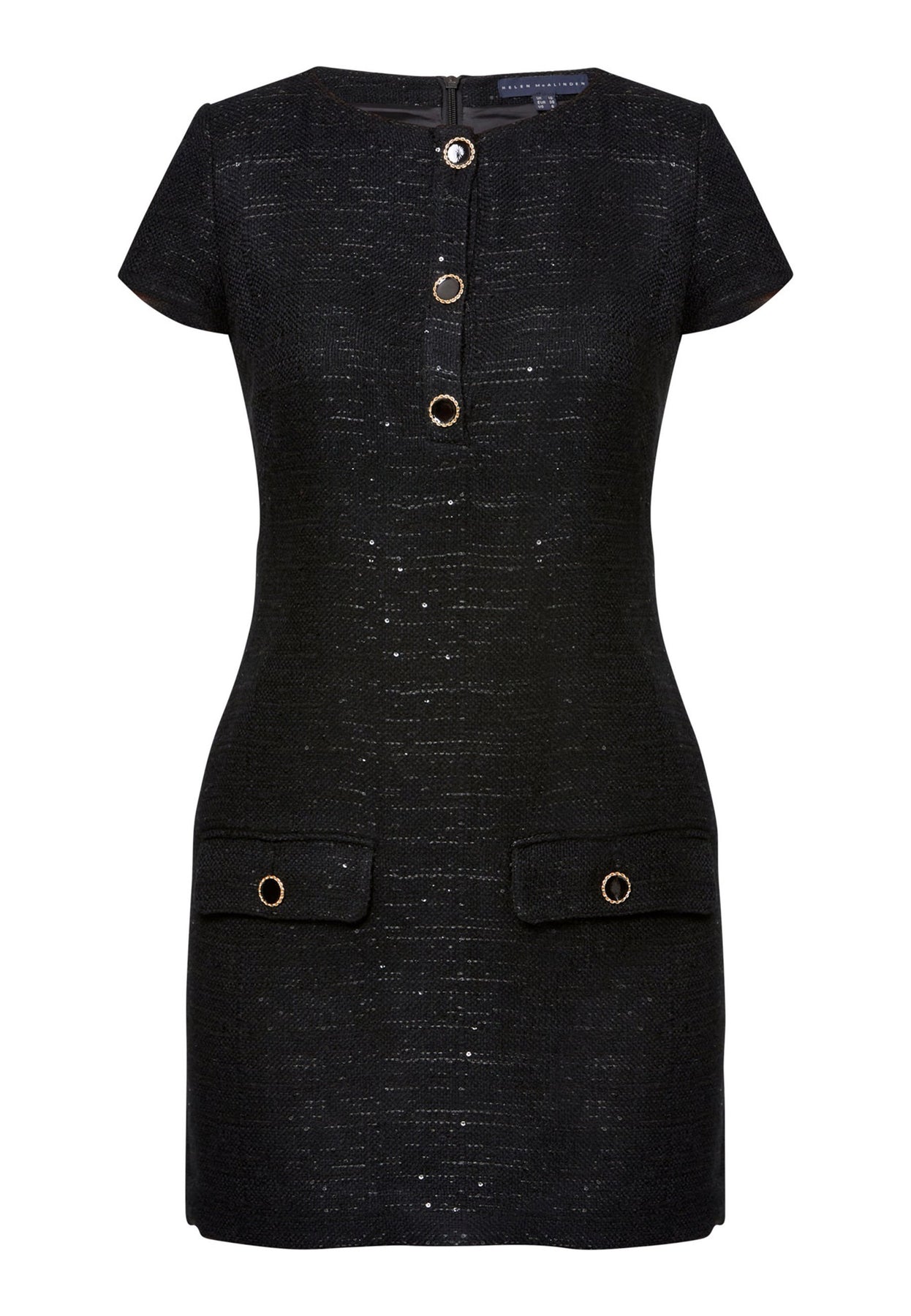 Cut from a textured tweed with a subtle sheen, the tailored silhouette features a round neckline, short sleeves and a streamlined mini length for a clean finish. Statement gold-trimmed buttons highlight the front placket and flap pockets, adding polish to the classic shape. Fully lined for comfort and structure, it transitions effortlessly from day to evening – just switch flats for heels.