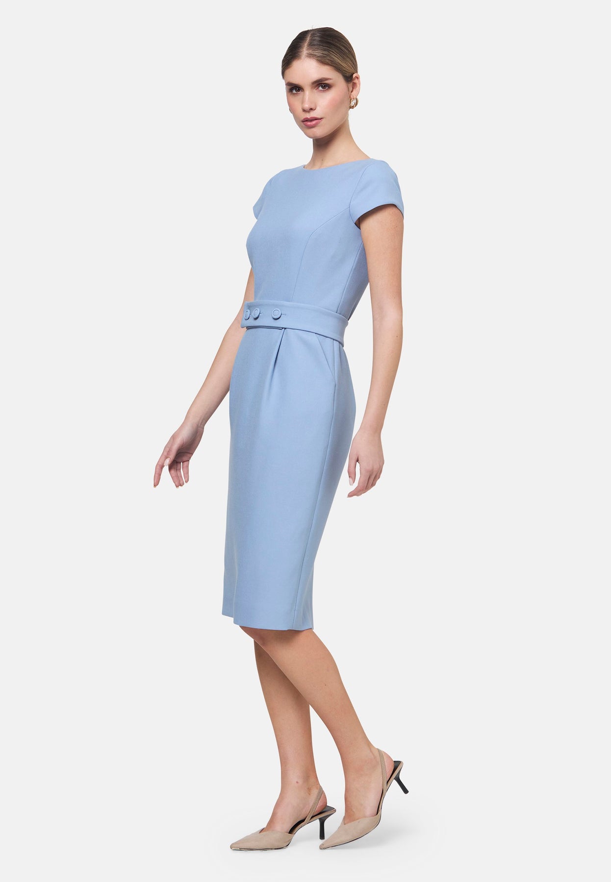 Bianca, a capped-sleeve dress featuring a slash neck and pencil skirt silhouette. Accompanied by a detachable belt featuring matching covered buttons for the option of a more cinched waistline. Crafted from our signature tricotine with a touch of elastane, ensuring both comfort and movement whilst maintaining a flattering structure. Pair with a trench coat and heels for a chic look.