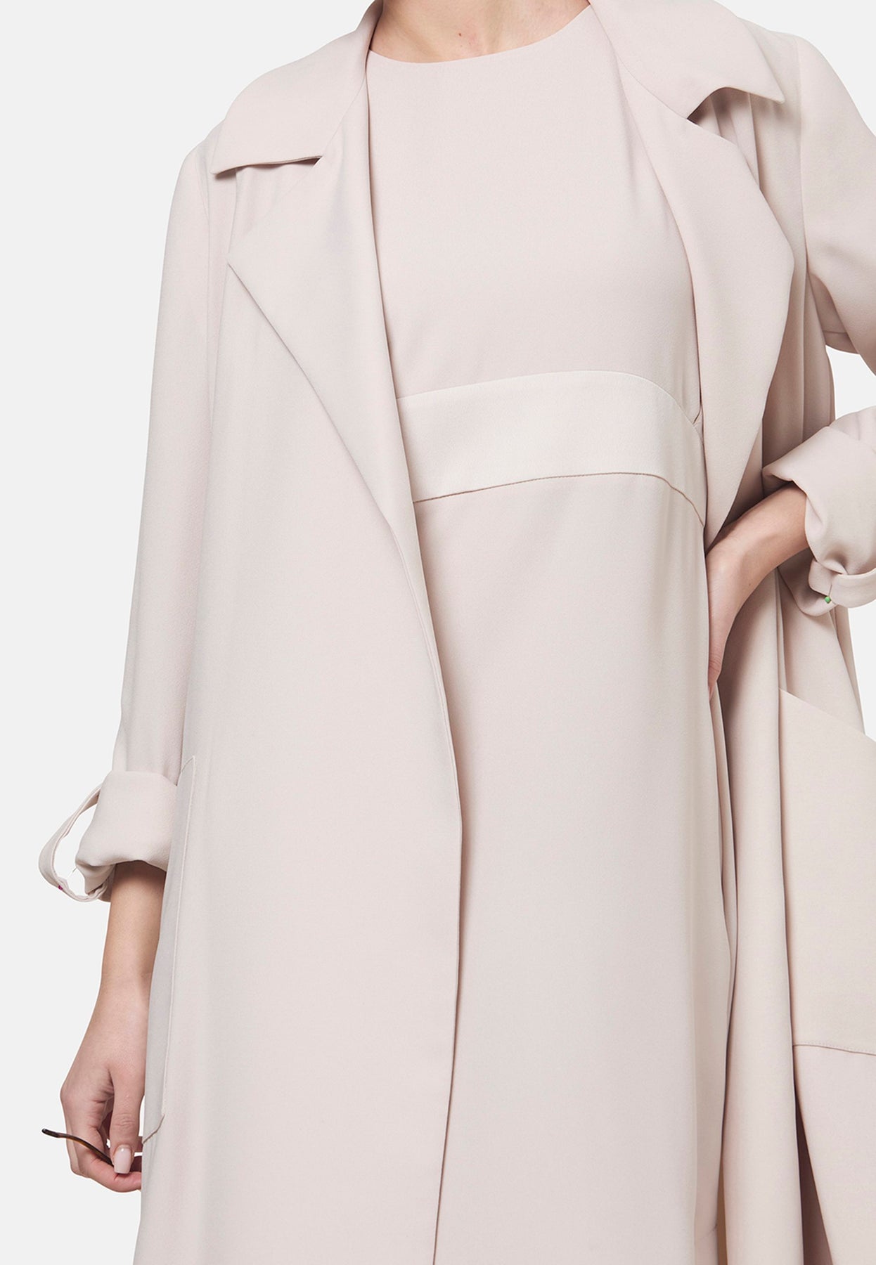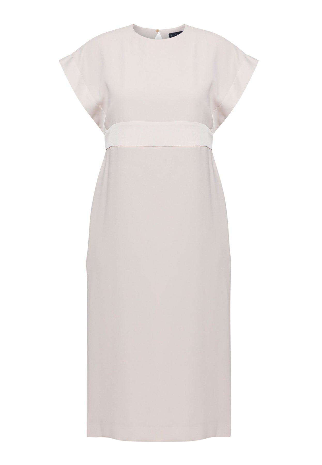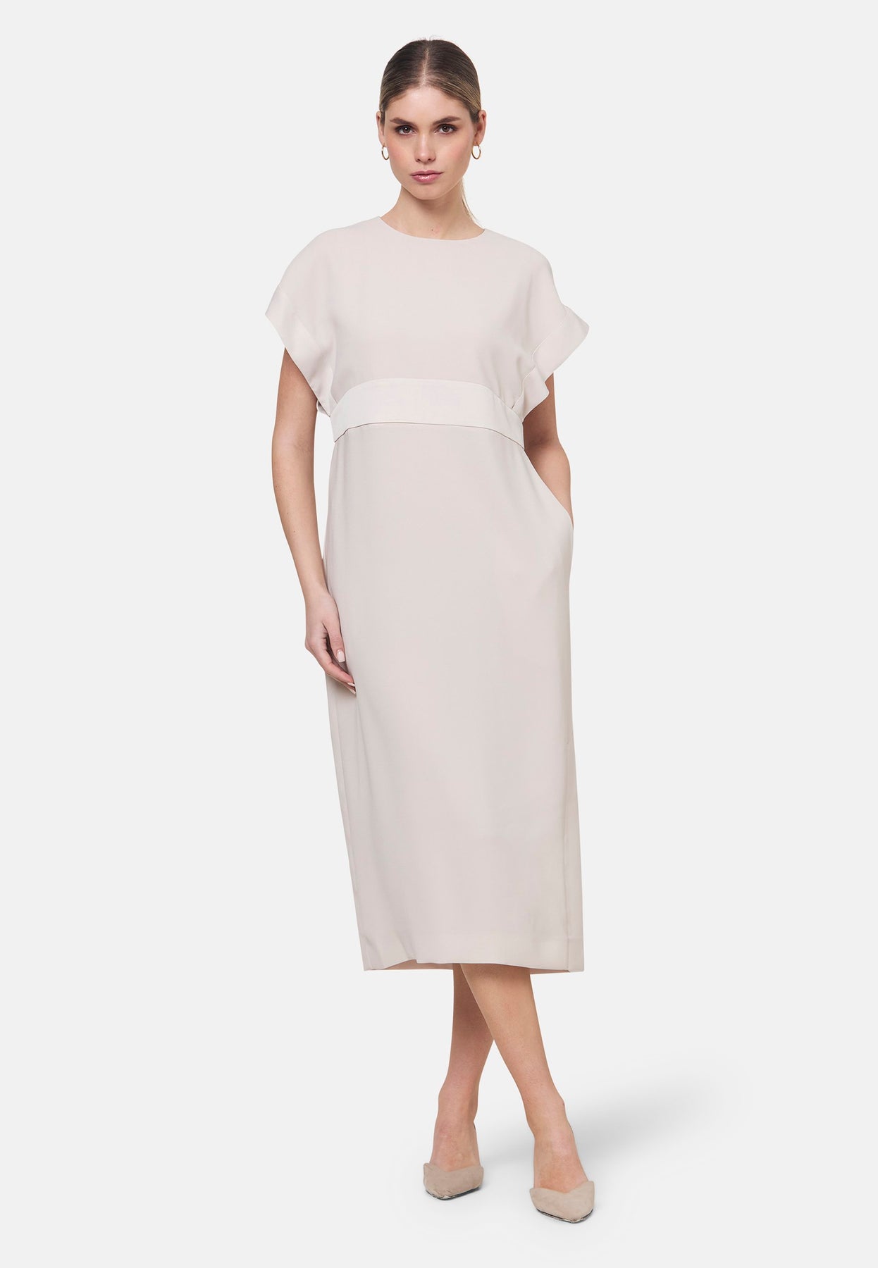 Elevate your wardrobe with the Shiv dress, a simple Natural Pearl tone midi dress cut from satin-back crepe. Featuring dropped sleeves, a gathered back waist seam, and a side slit for ease of movement. The back has a keyhole detail with a button closure. Perfect for a summer wedding or afternoon luncheons.