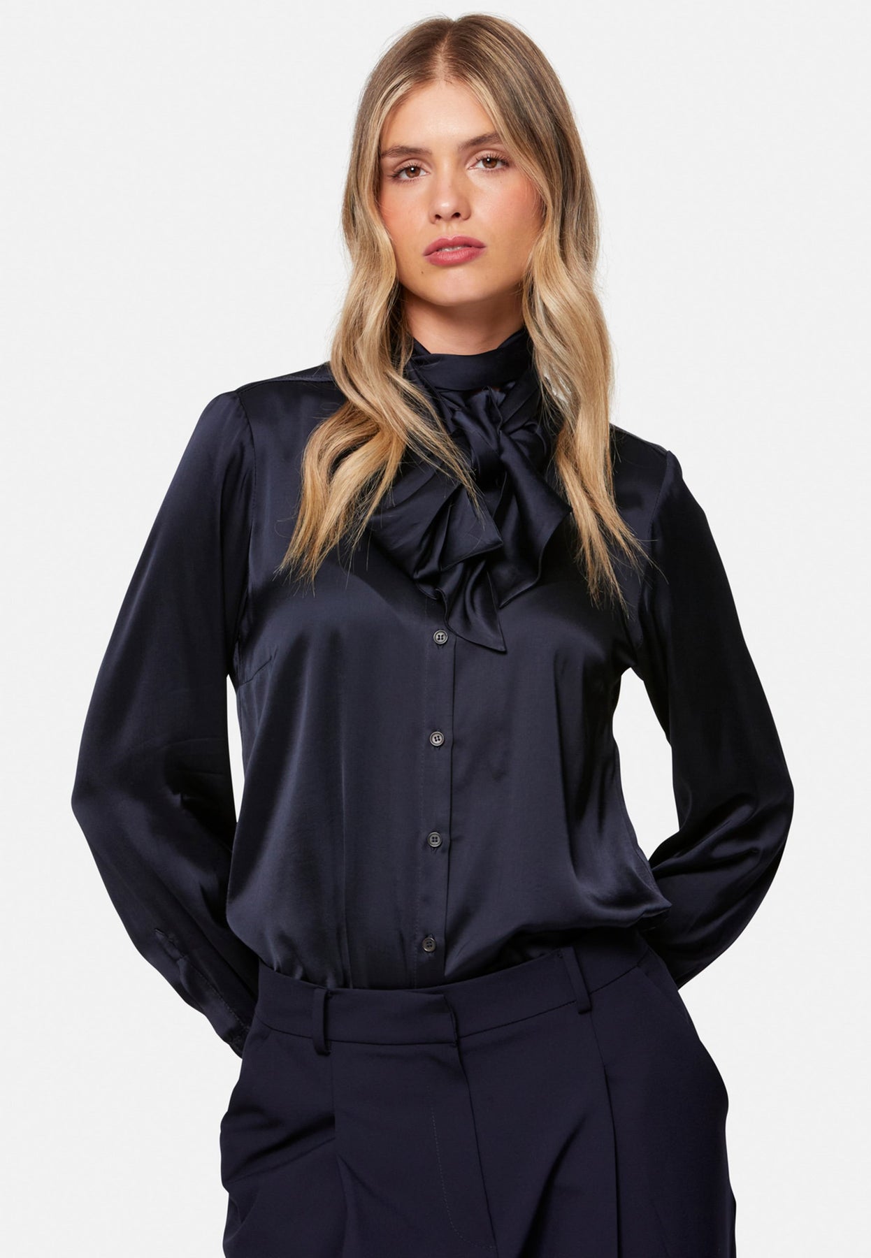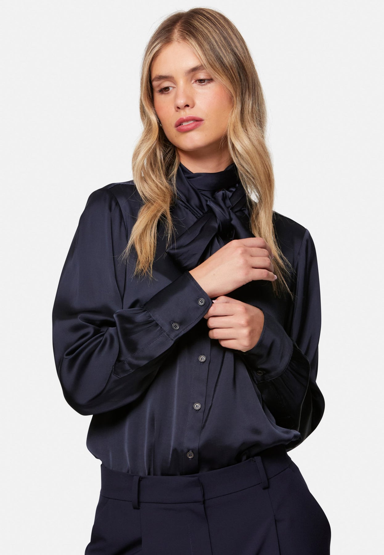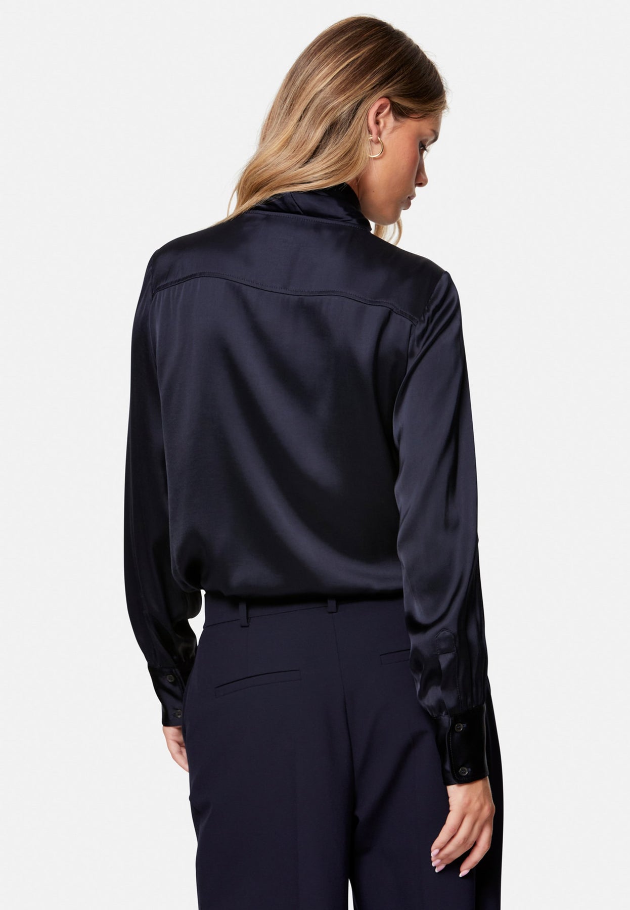 Anastasia, the silk-touch satin viscose shirt that works desk to dinner. Cut in deep navy with a round neckline and a pussy-bow tie - drape or knot for versatile styling options. Fluid through the body with soft-volume sleeves and deep cuffs, it buttons cleanly through the front. Pair with our navy suiting for a polished, monotone look.