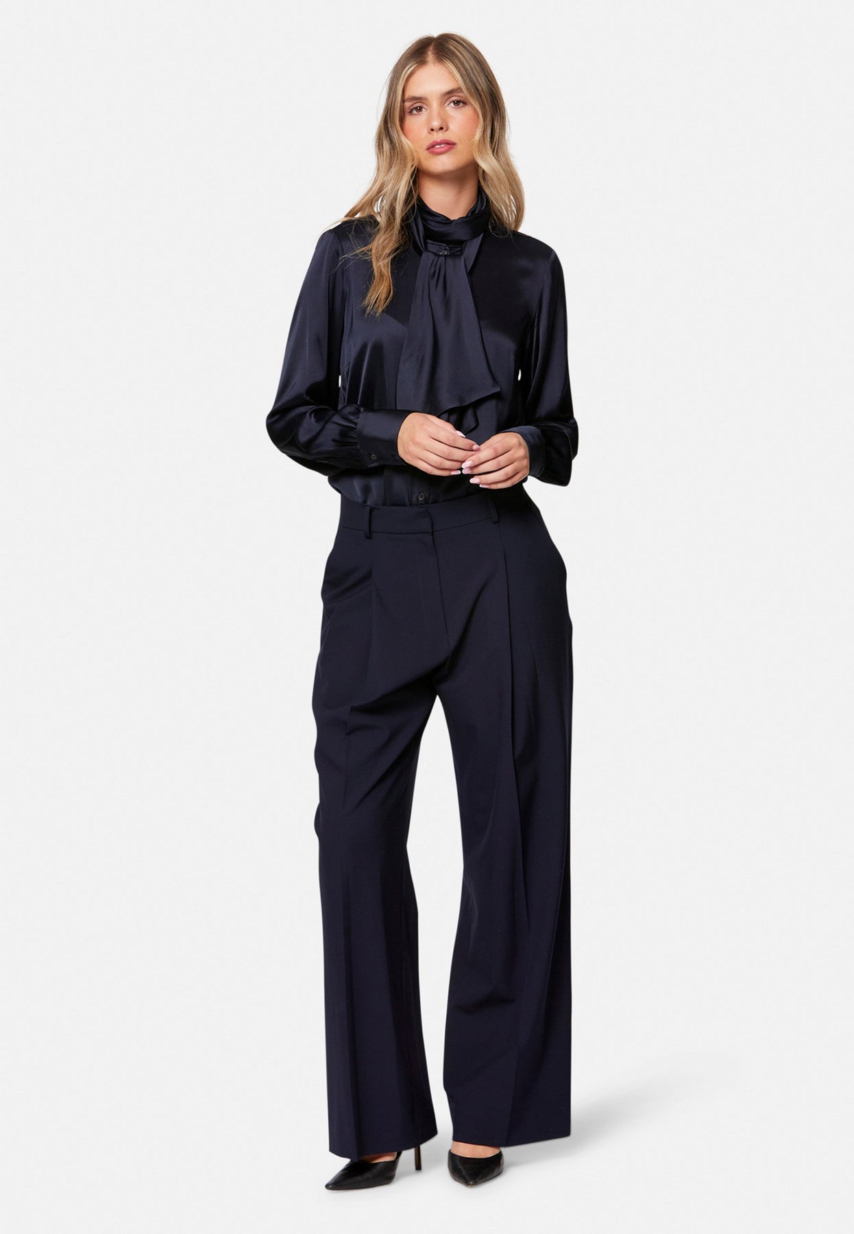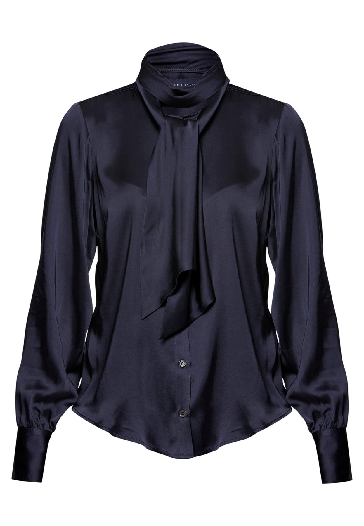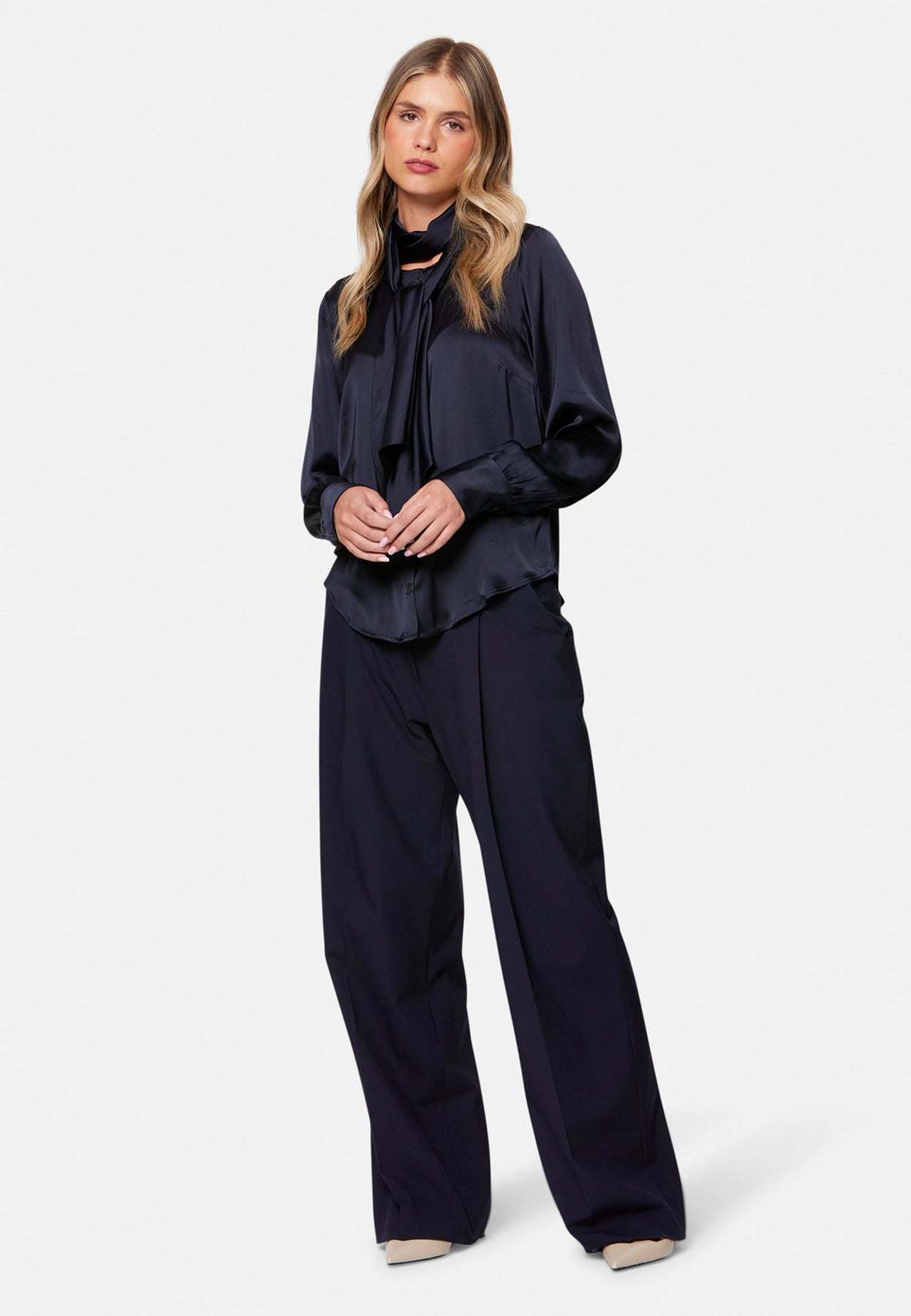 Anastasia, the silk-touch satin viscose shirt that works desk to dinner. Cut in deep navy with a round neckline and a pussy-bow tie - drape or knot for versatile styling options. Fluid through the body with soft-volume sleeves and deep cuffs, it buttons cleanly through the front. Pair with our navy suiting for a polished, monotone look.
