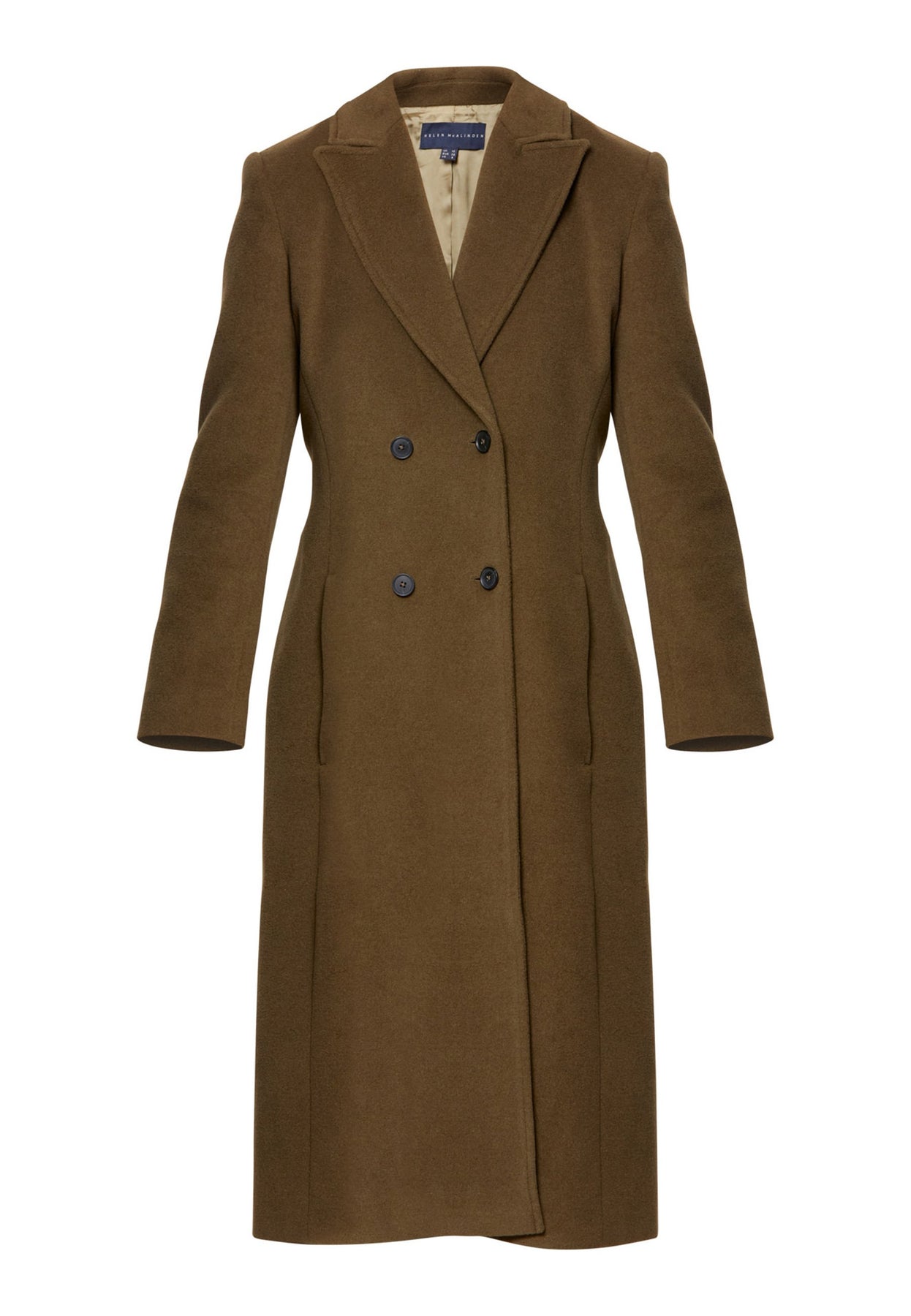 Luxurious wool and cashmere melton coat in rich umber. This semi-fitted, double-breasted style features sharp peak lapels, side seam pockets and a back vent, falling to the mid-calf. A versatile coat and timeless wardrobe essential.