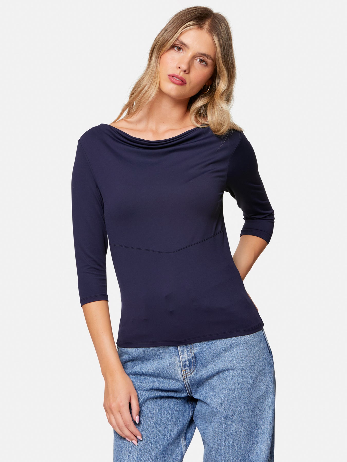 A wardrobe staple. Three-quarter sleeve, cowl top perfect for work or play.