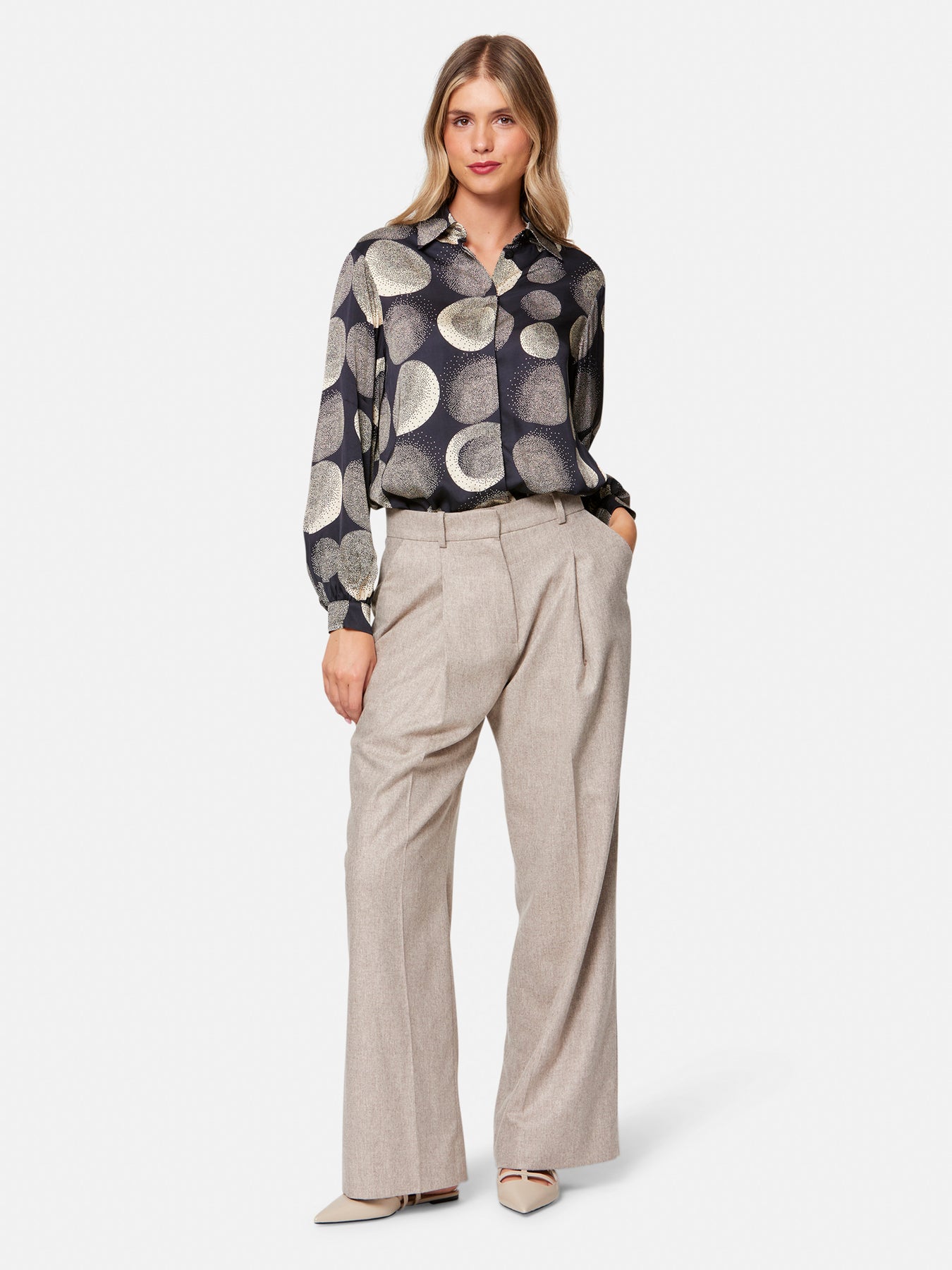 Lyra Trousers in melange mink, crafted from a soft-touch wool blend. This pleated front wide-leg relaxed fit trousers offer a timeless and versatile look suitable for both professional and casual settings. Pair the Anastasia Ivory silk blouse and matching Marlow Jacket for a chic tonal outfit.