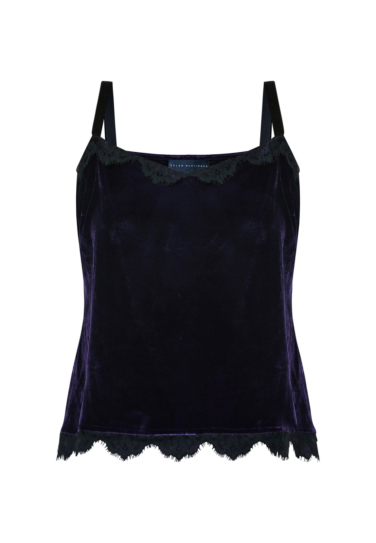Crafted from a viscose and silk blend with a hint of stretch, the Cleo Velvet Cami in twilight plum features delicate black lace trim on the neckline and hem, complemented by black velvet straps. Pair with the matching velvet suit for a full glam winter look or style with a simple tailored tux for understated elegance.