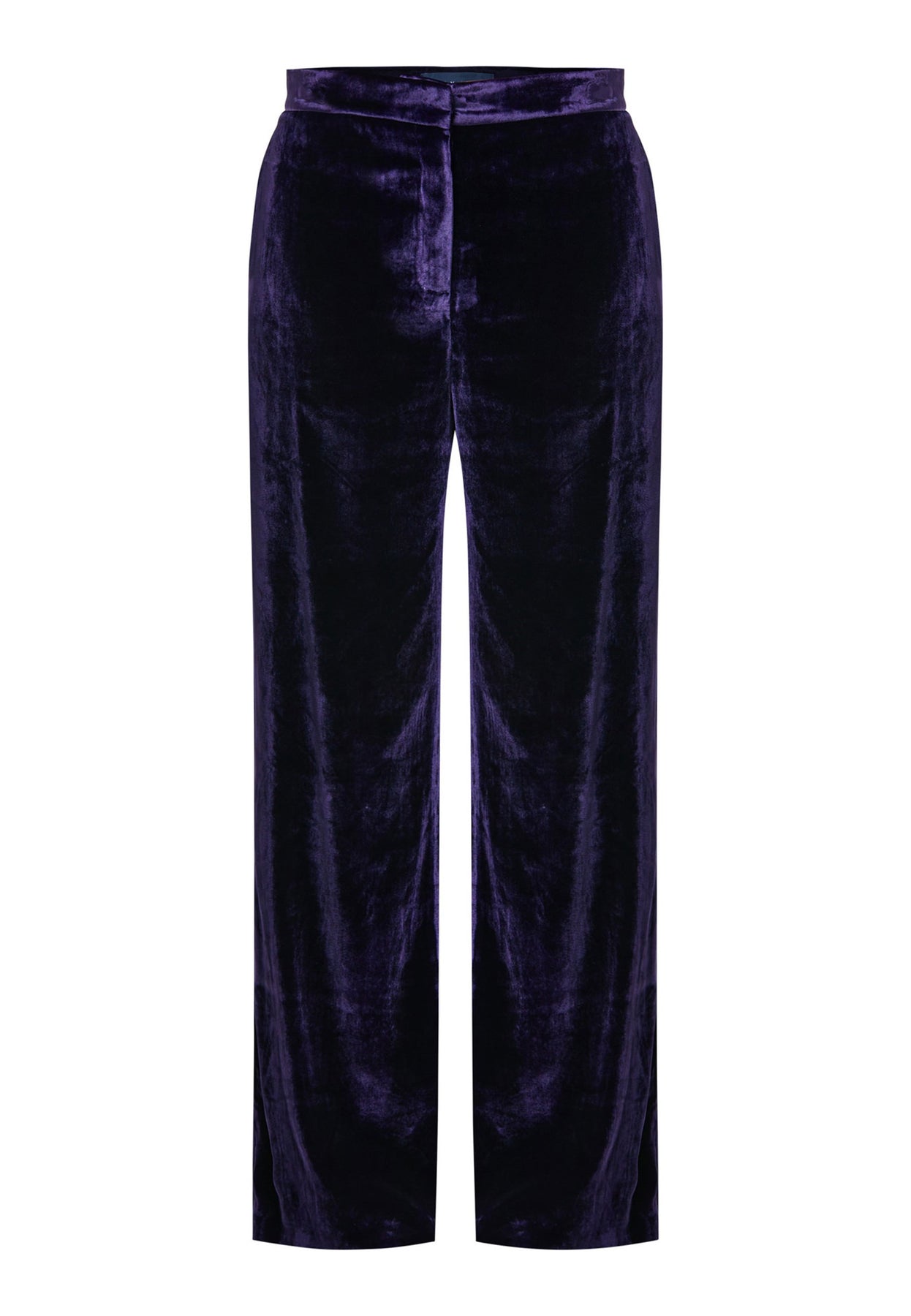 Indulge in luxurious comfort with our twilight plum wide-leg trousers. Flat-front trousers sit perfectly at the natural waist and include side pockets. Made from a premium purple tone velvet, a blend of silk and viscose, they exude elegance and sophistication.