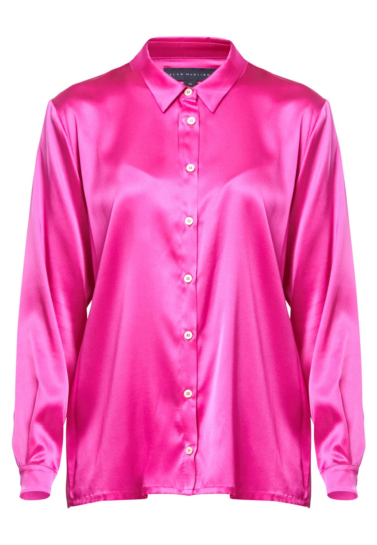 Cut from 100% silk satin, it drapes beautifully with a relaxed, slightly oversized fit. A neat collar, button-through front, back yoke, subtle box pleat and buttoned cuffs keep the look sharp, while the gently curved hem works tucked or loose. Pair with our cyclamen suiting for a polished monochrome look.
