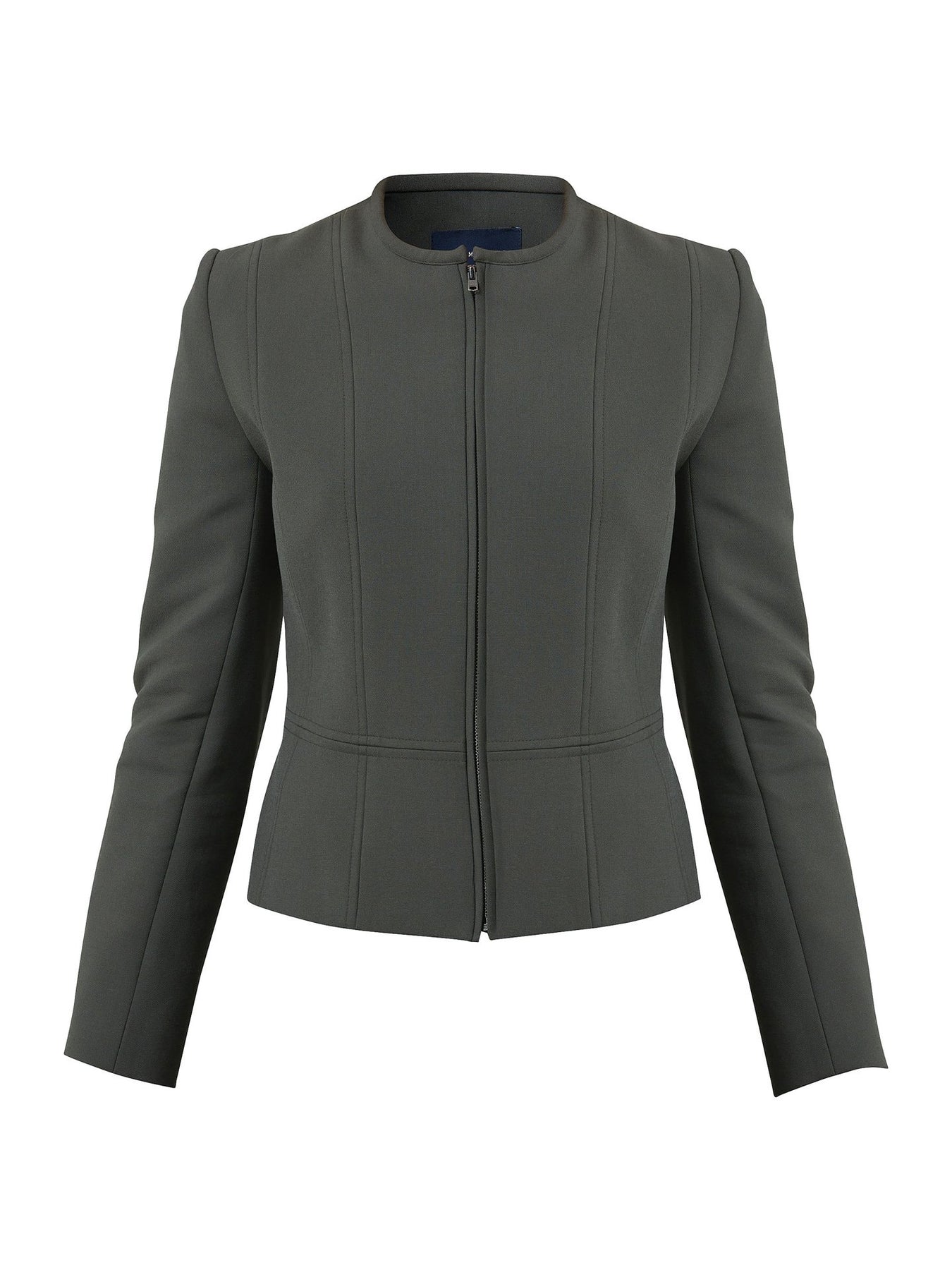 Upgrade your workwear options with the christiana smokey olive jacket. cut in our signature double crepe with a hint of stretch. Offers comfort & functionality. Engineered with an elegant seamed silhouette & center front zip. Pair with the co-ordinating jill trouser. This contemporary silhouette will become your workwear icon for the season.