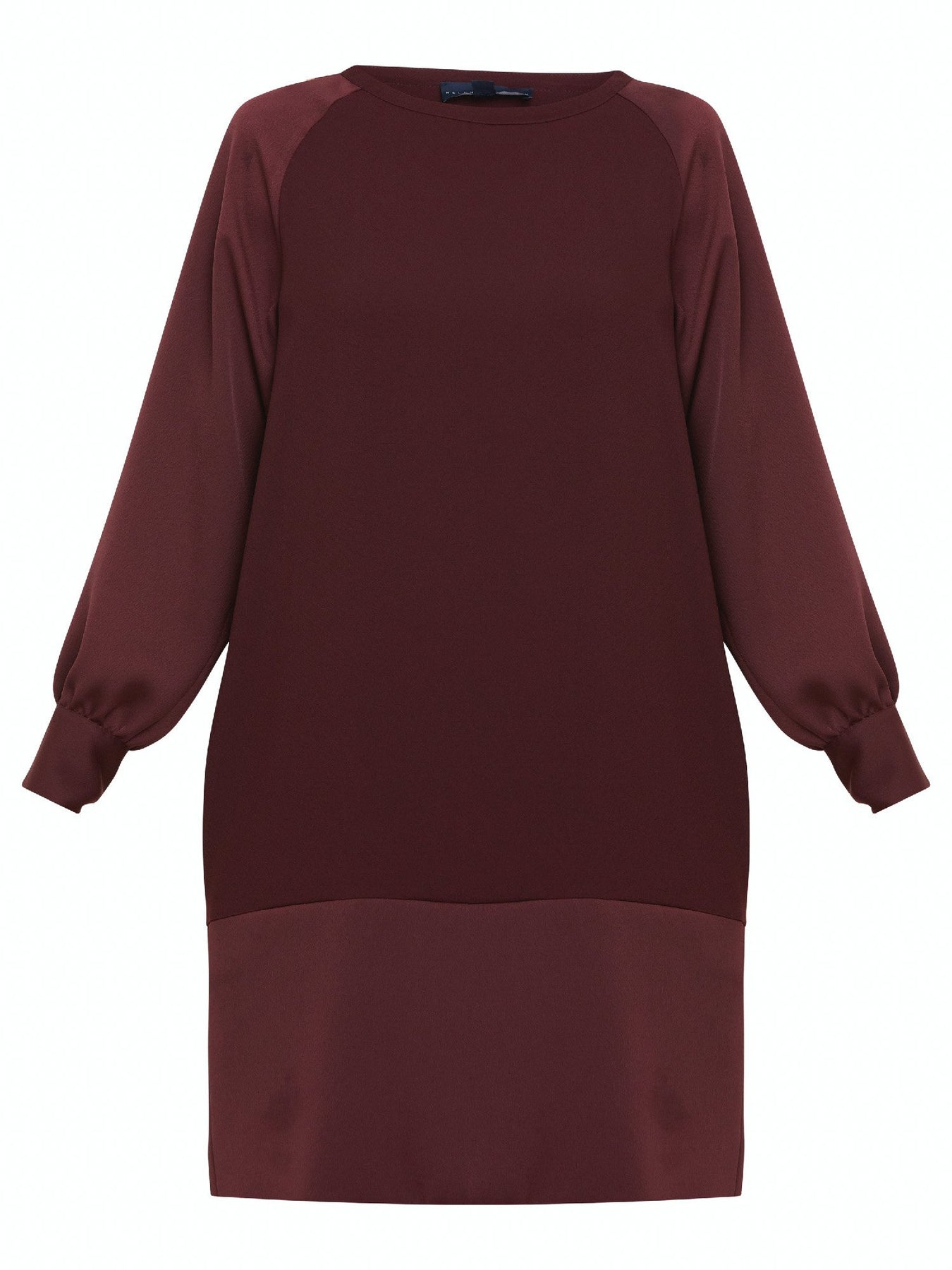 Sarah, a simple easy-fit shift dress. Crafted in a satin back crepe in rich burgundy. Features a satin raglan sleeve & a deep satin band at the hem which adds elegance to this versatile piece. Offers handy side seam pockets for added comfort and functionality. A fresh take on occasion wear.