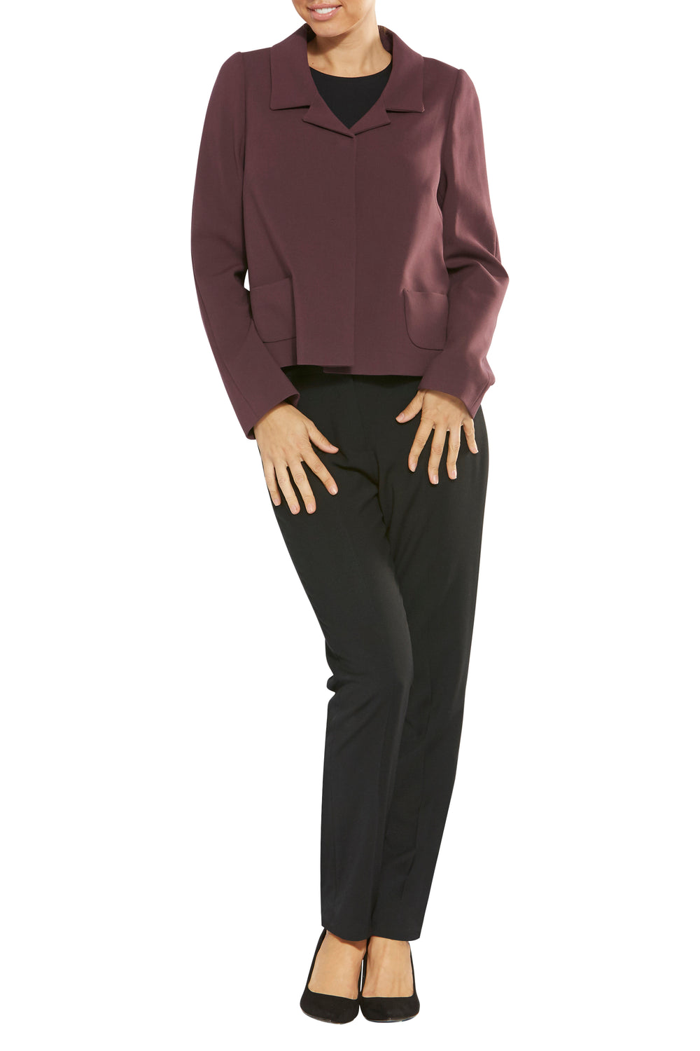 Add a pop of color to your winter wardrobe with our waist-length grape thistle swing jacket with concealed fastenings. This versatile piece works in many ways. Wear it over jeans with heels, or for a new take on the tux team it with our slim Jill pant.