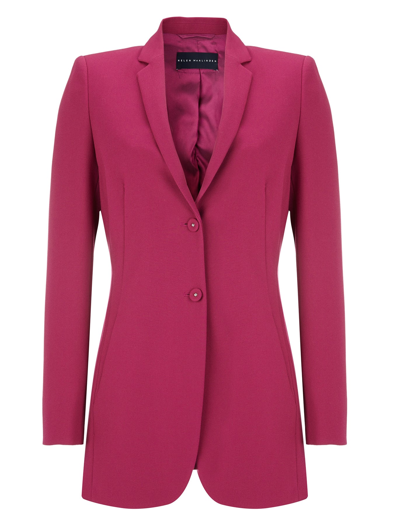 Add a pop of color to your winter wardrobe with our fitted, long line, body-skimming jacket in striking raspberry. This versatile piece works in many ways. For the office team with our slim Jill pant.