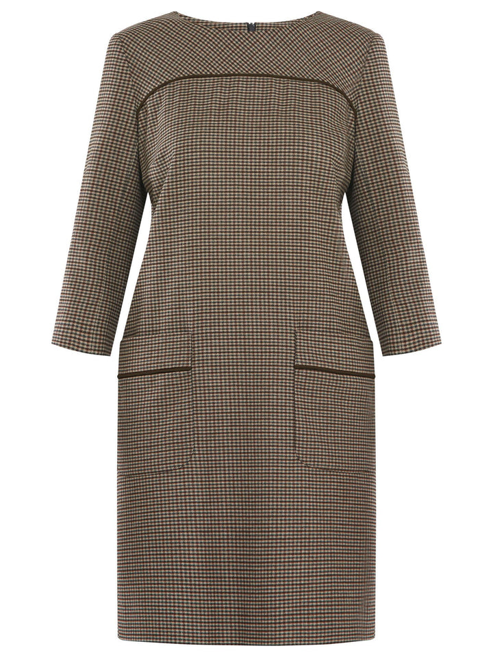 Cilla shift dress in our soft handle micro-check. Sophisticated city style with a hint of heritage. A simple yet flattering silhouette with suede piping detailing accentuates the bias cut yoke detail and pockets.