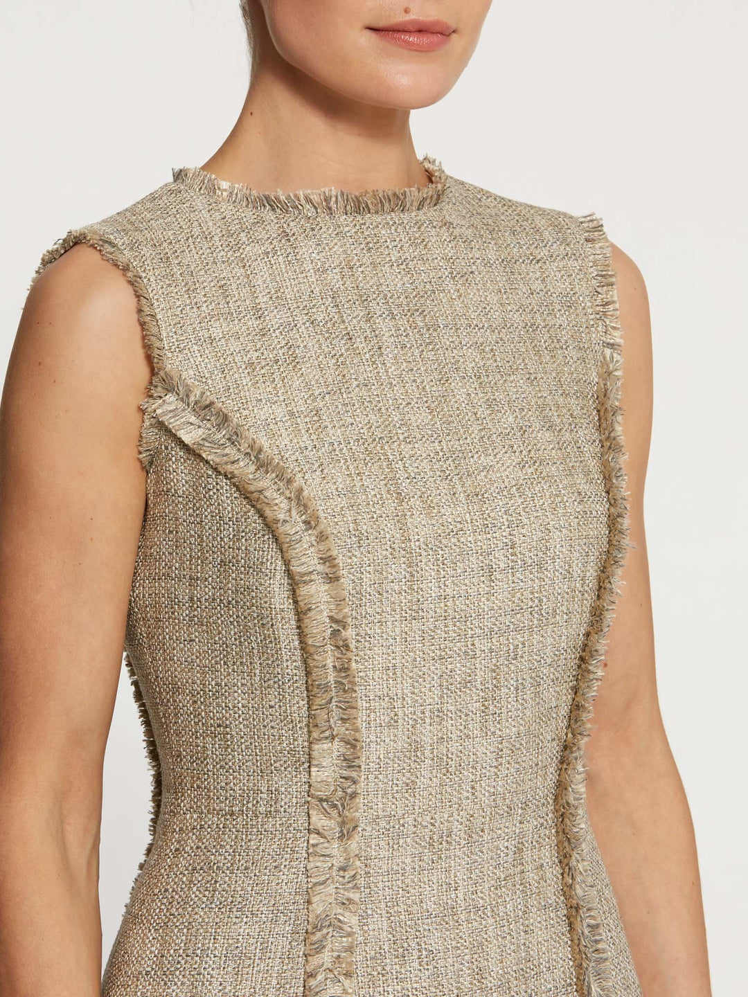 Sleeveless body skimming pencil-skirted dress, which falls to mid-calf seams accentuated with chanel type fringe detail in our most luxurious linen look tweed with a touch of sparkle in lurex.